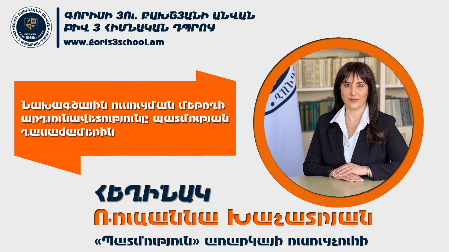 Գորիսի Յուրի Բախշյանի անվան թիվ 3 հիմնական դպրոցի «Պատմություն» առարկայի ուսուցչուհի Ռուզաննա Խաչատրյանը Հումանիտար առարկաների մեթոդմիավորման նիստի ընթացքում հանդես է եկել զեկուցուվ, որում ներկայացրել է «Նախագծային ուսուցման մեթոդի արդյունավետությունը պատմության դասաժամերին» թեմայով հետազոտական աշխատանքը:
