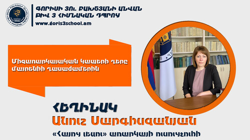 Գորիսի Յուրի Բախշյանի անվան թիվ 3 հիմնական դպրոցի «Հայոց լեզու» առարկայի ուսուցչուհի Անուշ Սարգիսջանյանը Հումանիտար առարկաների մեթոդմիավորման նիստի ընթացքում հանդես է եկել զեկուցուվ, որում ներկայացրել է «Միջառարկայական կապերի դերը մայրենիի դասաժամերին» թեմայով հետազոտական աշխատանքը: